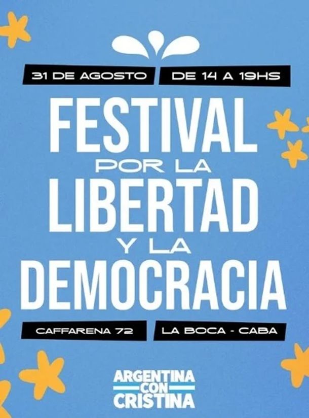 Organizaciones organizan un nuevo festival por "la libertad y la democracia", en apoyo de la expresidenta y actual titular del Partido Justicialista (PJ) Nacional, Cristina Kirchner.