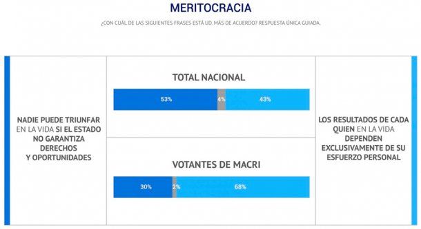 En el clivaje sobre el discurso meritocrático también las diferencias son elocuentes: el 68% de los votantes M considera que “los resultados de cada quien en la vida dependen exclusivamente de su esfuerzo personal”, mientras que el 30% opina que “nadie puede triunfar en la vida si el Estado no garantiza derechos y oportunidades”. Entre los votantes K, la proporción es: 73% de “colectivistas” versus 25% de “individualistas”.