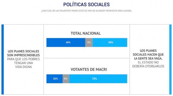 Las posiciones sobre las políticas sociales también son un eje donde se observa fuertemente el componente ideológico del votante macrista: en el universo M, el 72% cree que los “planes sociales hacen que la gente sea vaga”, mientras que un minoritario 20% cree que “son imprescindibles para que los pobres tengan una vida digna”. Entre los votantes del universo K la distribución es exactamente inversa: 19%/75%.