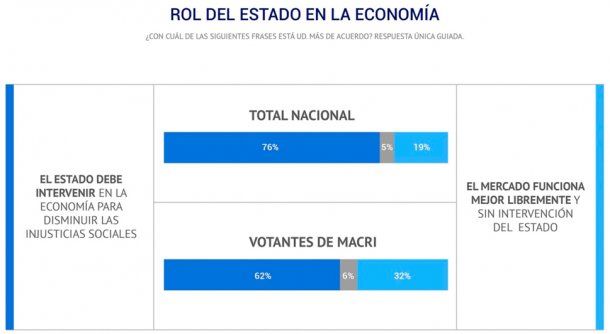 Acerca del rol del Estado en la economía, el 76% de los argentinos considera que su intervención es necesaria para disminuir las injusticias sociales, mientras que el 19% cree que lo óptimo es dejar funcionar libremente al mercado. Entre los votantes K, la proporción de “intervencionistas” crece hasta 89%. Entre los votantes de Macri, en cambio, cae hasta el 62% y aumenta considerablemente el porcentaje de los que están a favor del libre mercado: 32%. Los datos son significativos teniendo en cuenta la tradición histórica del país y el acuerdo transversal sobre la importancia asignada al Estado.