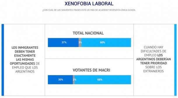En el eje xenofobia laboral, el 68% de los votantes de Macri cree que los argentinos deberían tener prioridad frente a los extranjeros en contextos de crisis, mientras que el 30% considera que los inmigrantes deben tener exactamente las mismas oportunidades de empleo que los argentinos.