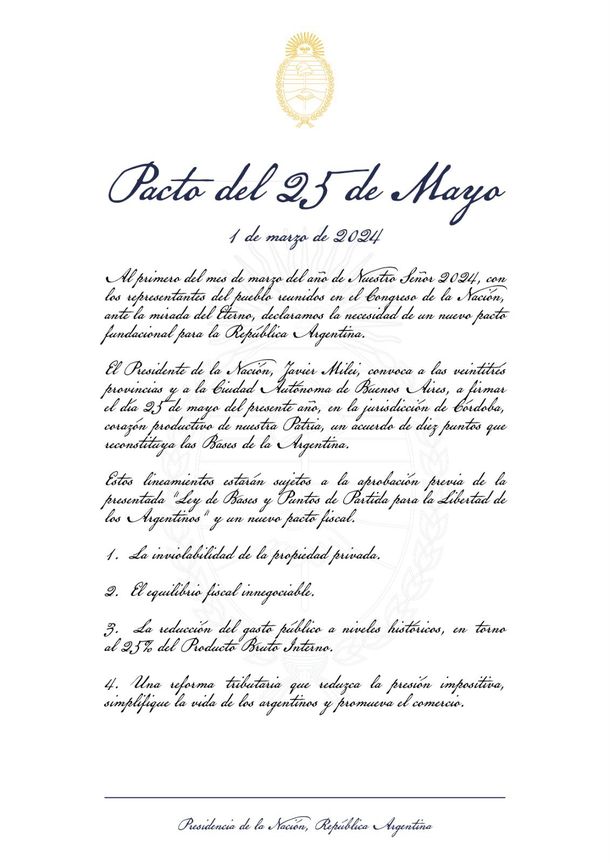 De cara al Pacto de Mayo que Javier Milei busca firmar con los gobernadores para inaugurar un "nuevo pacto social". Sin embargo cede poco y las provincias intentan consensuar un documento con sus propias reivindicaciones.