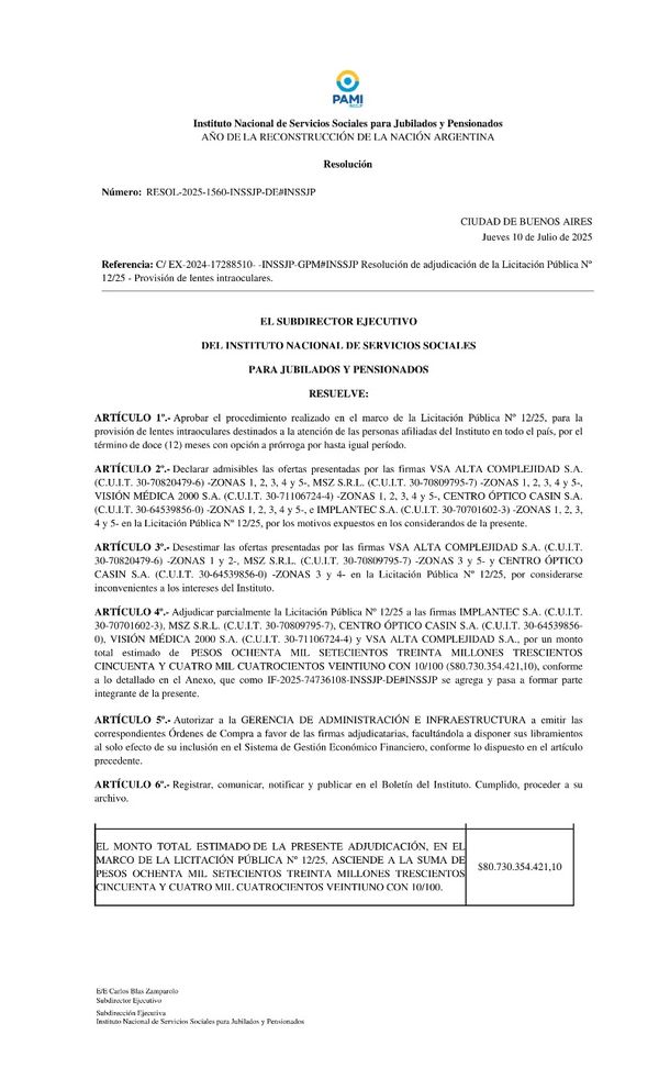 Todo surgió luego de que se denunciaran irregularidades en la Licitación Pública 12/25, con compras a Implantec, MSZ, Centro Óptico Casin, Visión Médica y VSA Alta Complejidad, que alcanzan los $80.730.354.421.
