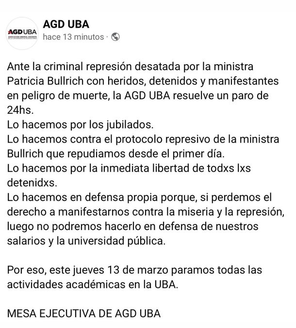 La Asociación Gremial Docente (AGD) de la Universidad de Buenos Aires (UBA) realiza un paro total de actividades este jueves con una duración de 24 horas. Es en respuesta a “la criminal represión” desatada durante la marcha de ayer entre barras bravas y policías. El sindicato había convocado a la protesta para respaldar el reclamo de los jubilados.