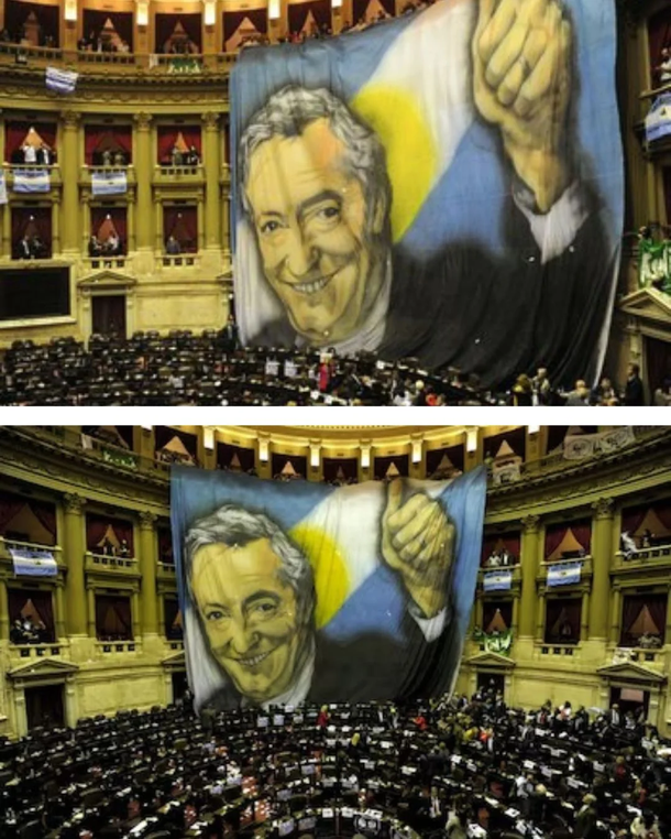 Durante los festejos, la agrupación juvenil La Cámpora desplegó un inmenso lienzo con el rostro del fallecido expresidente Néstor Kirchner sobre la fachada del Palacio Legislativo.