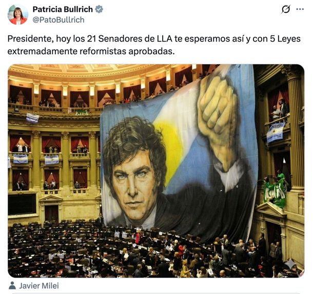 En muestra de apoyo al Presiente en la antesala a la apertura de las sesiones ordinarias del Congreso, la exministra de Seguridad subió una foto de una supuesta bandera argentina gigante, con la cara de Milei, en el Congreso. Esa imagen ya había sido utilizada por tuiteros libertarios en otras ocasiones.