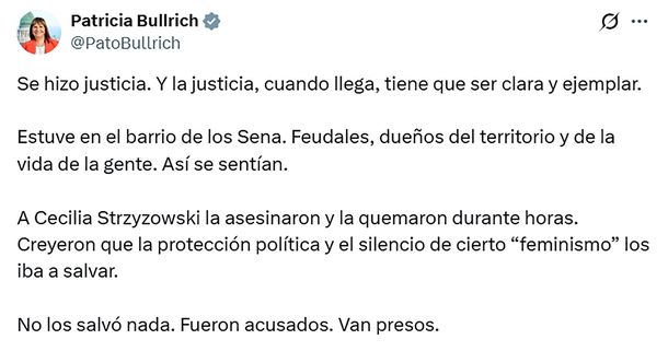 Para Bullrich, “a Cecilia Strzyzowski la asesinaron y la quemaron durante horas. Creyeron que la protección política y el silencio de cierto ‘feminismo’ los iba a salvar. No los salvó nada. Fueron acusados. Van presos”, concluyó la senadora electa por La Libertad Avanza (LLA).