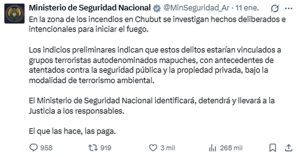 Los incendios forestales en Chubut continúan generando gran indignación, dado que se ha comprobado que han sido intencionales. En este sentido, la exministra de Seguridad y ahora senadora, Patricia Bullrich, se valió de un mensaje de la cartera que antes dirigía para vincular al gran siniestro con los mapuches.