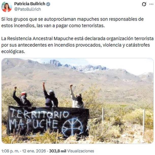 "Si los grupos que se autoproclaman mapuches son responsables de estos incendios, las van a pagar como terroristas. La Resistencia Ancestral Mapuche está declarada organización terrorista por sus antecedentes en incendios provocados, violencia y catástrofes ecológicas", escribió en sus redes sociales.