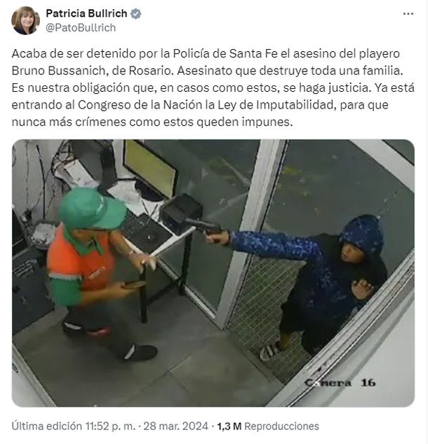 “Acaba de ser detenido por la Policía de Santa Fe el asesino del playero Bruno Bussanich, de Rosario. Asesinato que destruye toda una familia”, anunció Bullrich en redes sociales.