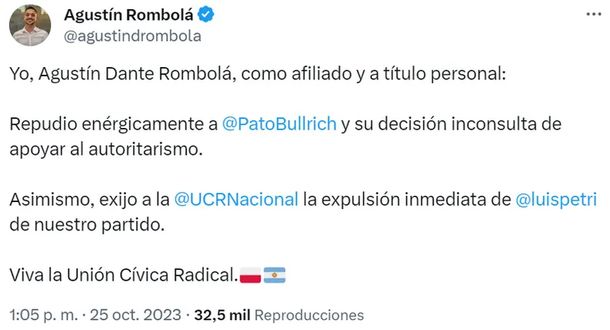"Yo, Agustín Dante Rombolá, como afiliado y a título personal: repudio enérgicamente a Patricia Bullrich y su decisión inconsulta de apoyar al autoritarismo. Asimismo, exijo a la UCR Nacional la expulsión inmediata de Luis Petri de nuestro partido. Viva la Unión Cívica Radical", subrayó Rombolá.