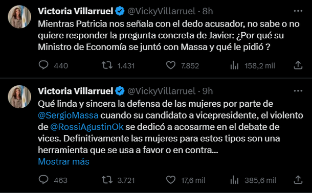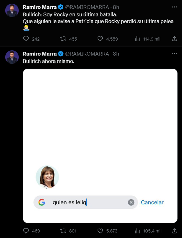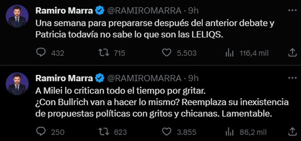 "Bullrich: Soy Rocky en su última batalla. Que alguien le avise a Patricia que Rocky perdió su última pelea", posteó Marra. También indicó en otro posteo: "Una semana para prepararse después del anterior debate y Patricia todavía no sabe lo que son las LELIQS" y finalmente: "A Milei lo critican todo el tiempo por gritar".