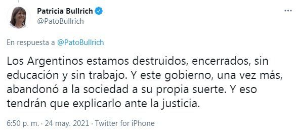 Por último, la presidenta del PRO se refirió al actual confinamiento y sostuvo: “Los argentinos estamos destruidos, encerrados, sin educación y sin trabajo. Y este Gobierno, una vez más, abandonó a la sociedad a su propia suerte. Y eso tendrán que explicarlo ante la justicia”.