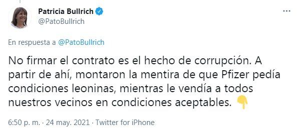 “El comunicado de Pfizer no niega nada de lo que yo digo. Por lo tanto, yo reafirmo mis dichos”, ratificó Patricia Bullrich este lunes por la noche luego de que el laboratorio emitiera un comunicado en el que aseguran no haber “recibido peticiones de pagos indebidos en ningún momento” durante las negociaciones por las vacunas contra el coronavirus.