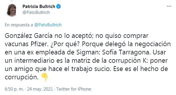 Y prosiguió: “González García no lo aceptó; no quiso comprar vacunas Pfizer. ¿Por qué? Porque delegó la negociación en una ex empleada de Sigman: Sofía Tarragona”.