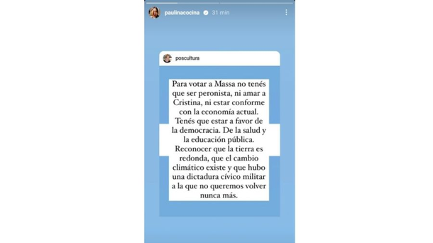 "Quería contarles que el domingo voy a votar a Massa, tengo mil motivos, mis dos más importantes: no apoyo ni apoyaré a quienes defienden públicamente la dictadura, y (uno del que se habla poco) me preocupa mucho tener un presidente que cree que el cambio climático no existe", manifestó Paulina.