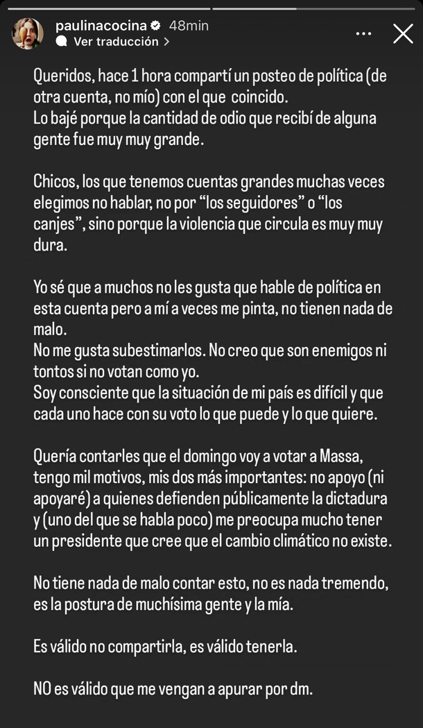 "Queridos, hace una hora compartí un posteo de política (de otra cuenta, no mío) con el que coincido. Lo bajé porque la cantidad de odio que recibí de alguna gente fue muy grande. Chicos, los que tenemos cuentas grandes muchas veces elegimos no hablar, no por 'los seguidores', o 'los canjes', sino porque la violencia que circula es muy dura", explicó Paulina Cocina.