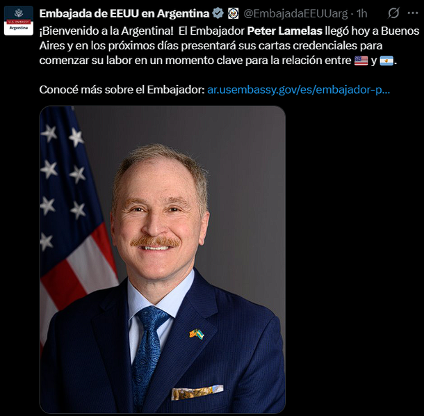La Embajada de Estados Unidos confirmó la noticia a través de sus redes sociales, donde expresó: “¡Bienvenido a la Argentina! El embajador Peter Lamelas llegó hoy a Buenos Aires y en los próximos días presentará sus cartas credenciales para comenzar su labor en un momento clave para la relación entre Estados Unidos y la Argentina”. Con ese mensaje, la sede diplomática dio inicio formal al mandato del sucesor en un puesto estratégico dentro de la región.