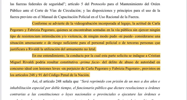 “Conforme se advierte de la videograbación incorporada al legajo, la actitud de Carla y Fabrizia Pegoraro, quienes se encontraban sentadas en la vía pública sin ejercer ningún tipo de resistencia intimidación y/o violencia, de ningún modo pudo -ni puede- considerarse una situación amenazante o de riesgo suficiente para el personal policial o de terceras personas que justificara a Rivaldi la utilización del armamento no letal”, advirtió el fiscal en la presentación.