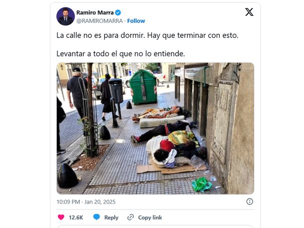 “La calle no es para dormir. Hay que terminar con esto. Levantar a todo el que no lo entiende”, dijo Marra en un posteo en X.
