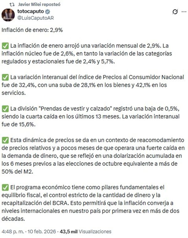 Tras conocerse el dato de inflación de enero, que fue del 2,9% según el Indec y sin aplicar el nuevo cálculo, el presidente Javier Milei esta vez no reaccionó eufórico ante el nuevo índice y solo se limitó a replicar la publicación del ministro de Economía, Luis Caputo, explicando los motivos de la suba.