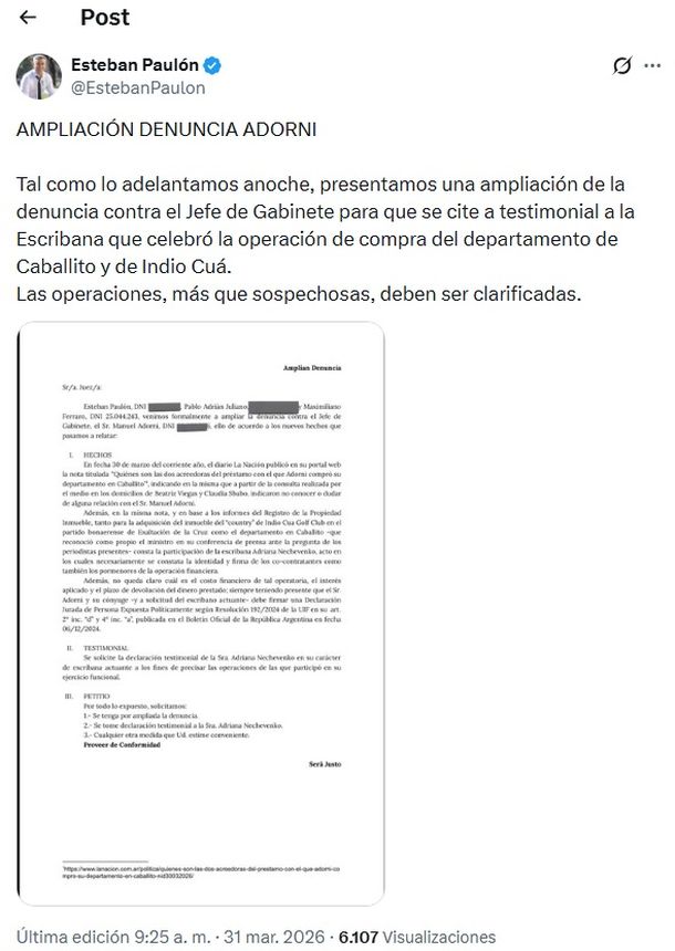 Presentaron una ampliación de la denuncia contra Manuel Adorni y piden que declare la escribana