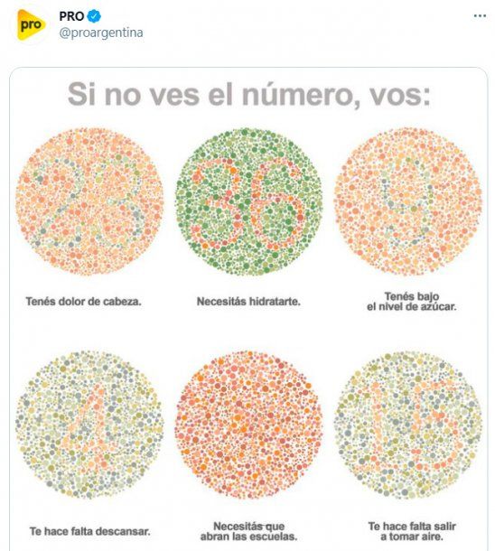 Desde su cuenta oficial de Twitter, el PRO utilizó un test para la vista que se utiliza para detectar daltonismo para presionar para que regresen las clases presenciales en medio de la pandemia por el coronavirus.