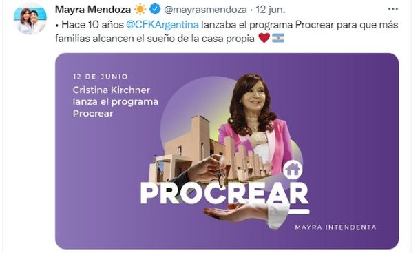 Y la intendenta de Quilmes, Mayra Mendoza, recordó en sus redes que "hace 10 años Cristina Fernández de Kirchner", entonces Presidenta de la Nación, "lanzaba el programa Procrear para que más familias alcancen el sueño de la casa propia".