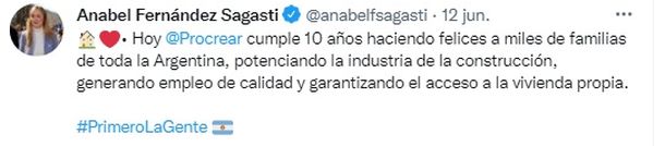 La senadora oficialista mendocina Anabel Fernández Sagasti marcó en Twitter que se cumplen "10 años haciendo felices a miles de familias de toda la Argentina, potenciando la industria de la construcción, generando empleo de calidad y garantizando el acceso a la vivienda propia".