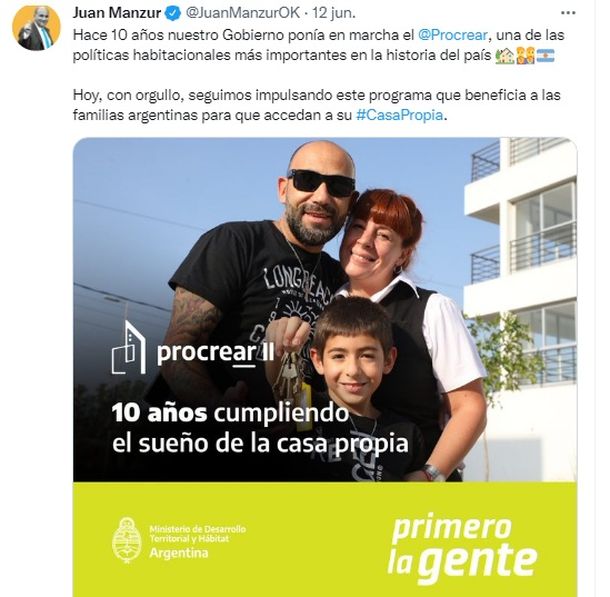 Por su parte, el jefe de Gabinete, Juan Manzur, celebró en la misma red social: "Hace 10 años nuestro Gobierno ponía en marcha el Procrear, una de las políticas habitacionales más importantes en la historia del país. Hoy, con orgullo, seguimos impulsando este programa que beneficia a las familias argentinas para que accedan a su Casa Propia".
