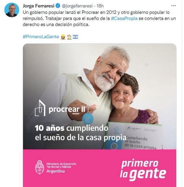 "El impulso inicial tomado hace 10 años se consolidó con el nacimiento del Ministerio de Desarrollo Territorial y Hábitat de la Nación. Nuestro horizonte es que cada familia argentina tenga su hogar. Vinimos a proponer un sueño", escribió en sus redes sociales el titular de la cartera de Hábitat, Jorge Ferraresi.