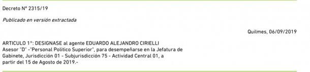 Cirielli fue asesor dentro de la Jefatura de Gabinete municipal. Así consta en el Boletín Oficial de Quilmes del 15 de agosto de 2019. Pese a que Martiniano perdió en las PASO no cesaron los nombramientos.
