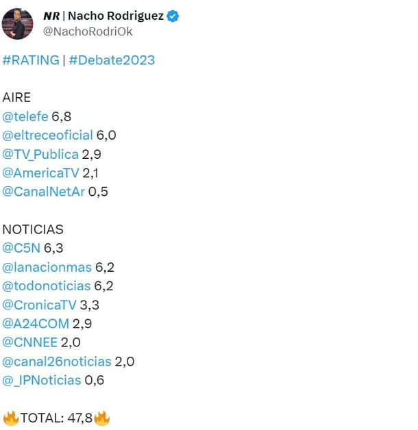 Todos los medios estaban habilitados a transmitir el debate, por lo que en suma de todos los canales que lo emitieron, el rating fue de casi 48 puntos. Lo más visto de aire fue Telefe, 6,8 sobre los 6,0 de ElTrece.