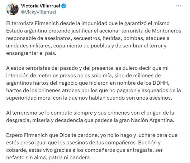 Villarruel volvió a insistir con su "agenda" en contra de las organizaciones revolucionarias que actuaron en las décadas de 1960 y 1970. Las calificó de "terrorista" y las responsabilizó de los males del país. "Al terrorismo se lo combate siempre y sus crímenes son el origen de la desgracia, miseria y decadencia que padece la gran Nación Argentina", escribió.