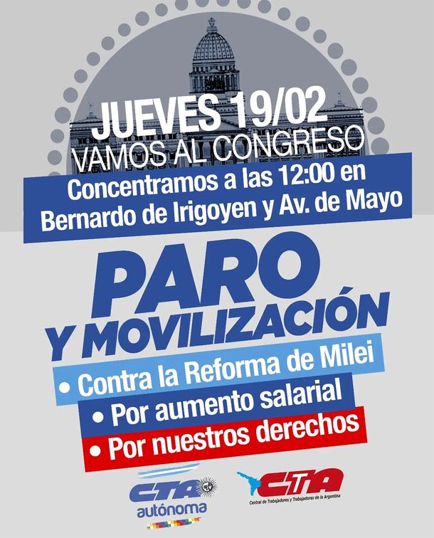 Los que sí tratarán de materializar el descontento en las calles serán los gremios agrupados en las dos CTA (Central de Trabajadores Argentinos), que también convocaron a un cese de actividades contra la reforma laboral, con influencia especial en el sector público, pero con fecha confirmada: el próximo jueves, cuando también se concentrarán desde el mediodía en Avenida de Mayo e Yrigoyen.