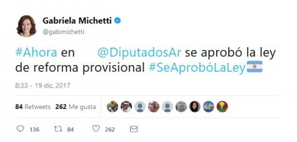 "Se aprobó la ley de reforma provisional", tuiteó Gabriela Michetti minutos pasados de las 8 de la mañana del martes.