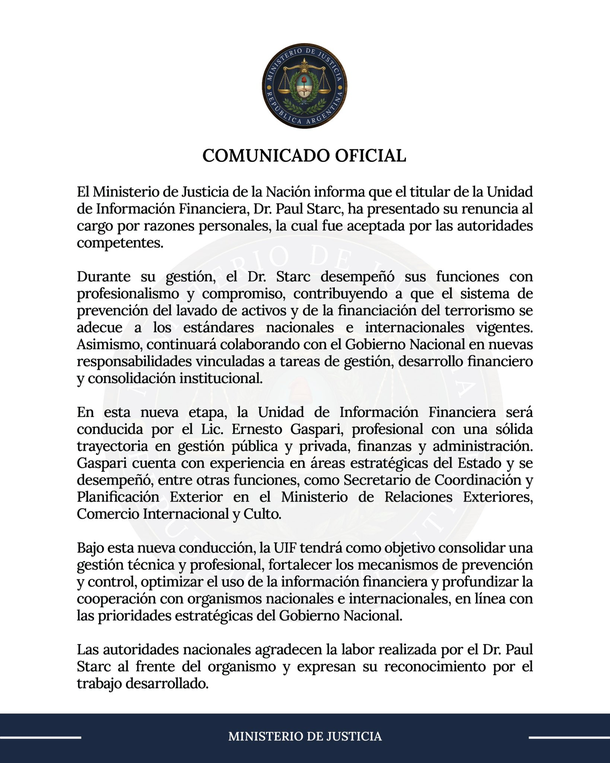 El Ministerio de Justicia de la Nación confirmó este jueves un cambio estratégico en el organigrama oficial. El titular de la UIF, Paul Starc, presentó su renuncia al cargo invocando motivos estrictamente personales, la cual fue aceptada de inmediato por las autoridades competentes. Según se informó en el comunicado oficial, su lugar será ocupado por el licenciado Ernesto Gaspari.