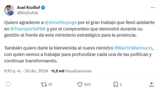 “Quiero agradecer a Jorge D’Onofrio por el gran trabajo que llevó adelante en el Ministerio de Transporte y por el compromiso que demostró durante su gestión al frente de este ministerio estratégico para la provincia”, escribió el gobernador en X.