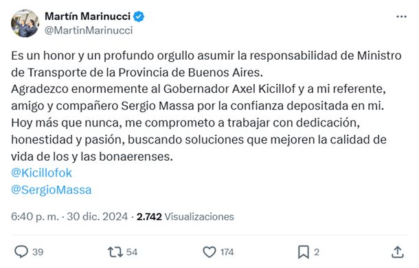 “Agradezco enormemente al Gobernador Axel Kicillof y a mi referente, amigo y compañero Sergio Massa por la confianza depositada en mí. Hoy más que nunca, me comprometo a trabajar con dedicación, honestidad y pasión, buscando soluciones que mejoren la calidad de vida de los y las bonaerenses”, completó.