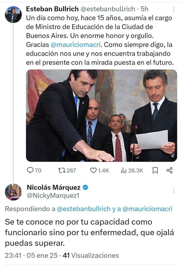 En las últimas horas, un cruce en redes sociales entre Esteban Bullrich y Nicolás Márquez -escritor, conferencista, abogado y biógrafo de Javier Milei- se viralizó en X, especialmente, por el despreciable comentario del libertario al exministro de Educación.