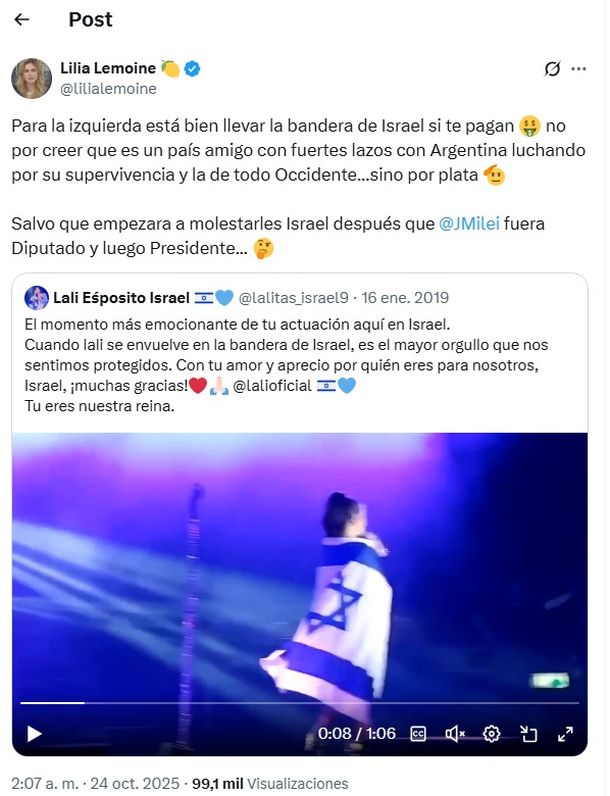 La diputada nacional oficialista Lilia Lemoine criticó a Lali Espósito por un viejo video de un concierto en Israel. La legisladora publicó un mensaje en la red social X y un video de la cantante con la bandera de ese país.
