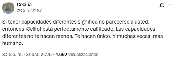Por su parte, una mujer escribió: "Si tener capacidades diferentes significa no parecerse a usted, entonces Kicillof está perfectamente calificado. Las capacidades diferentes no te hacen menos. Te hacen único. Y muchas veces, más humano".