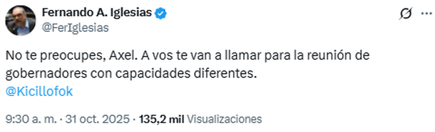 Tras ello, Fernando Iglesias sorprendió a los internautas de X en la mañana de este viernes con un repudiable tuit que fue ferozmente criticado: "No te preocupes, Axel. A vos te van a llamar para la reunión de gobernadores con capacidades diferentes", escribió el diputado del PRO y, por supuesto, aliado al Gobierno libertario.