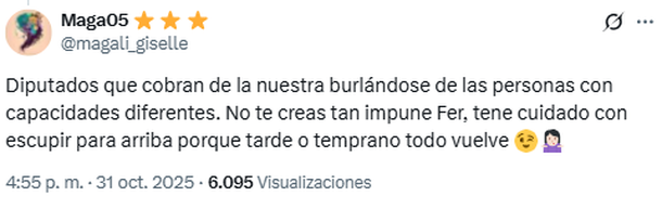 Otro, en tanto, le respondió: "Diputados que cobran de la nuestra burlándose de las personas con capacidades diferentes. No te creas tan impune Fer, tené cuidado con escupir para arriba porque tarde o temprano todo vuelve".