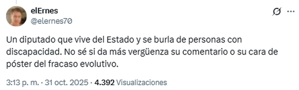 Como era de esperarse, los usuarios de X no dejaron pasar el insólito tuit del legislador y lo liquidaron: "Un diputado que vive del Estado y se burla de personas con discapacidad. No sé si da más vergüenza su comentario o su cara de póster del fracaso evolutivo", le contestó un internauta.