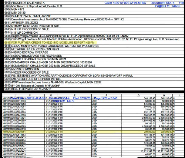 La transferencia que Espert no reconoció pero tampoco negó corresponde al 22 de enero de 2020, antes de que se revelara que Machado era buscado por la justicia estadounidense, y aparece en la documentación junto al nombre del diputado libertario y el código N28FM, que se corresponde con la matrícula del avión privado usó Espert para su campaña del año anterior, propiedad de Machado, acusado en los Estados Unidos de los delitos de conspiración para traficar drogas ilícitas, lavado de dinero y fraude.