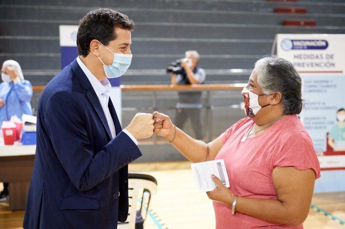 Junto al gobernador Sergio Uñac, De Pedro dialogó brevemente con algunas de las personas que esperaban su turno para ser vacunadas y se interiorizó con la marcha de la campaña de vacunación en esa provincia.
