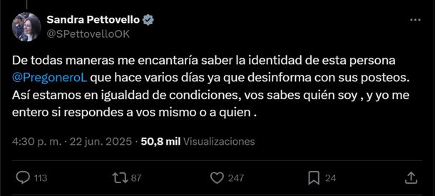 El intercambio tuitero siguió y la Sandra Pettovello insistió en que el tuitero estrella estaba mal informado y luego escribió: "De todas maneras me encantaría saber la identidad de esta persona @Pregonerol que hace varios días ya que desinforma con sus posteos. Así estamos en igualdad de condiciones, vos sabes quién soy, y yo me entero si respondes a vos mismo o a quien".