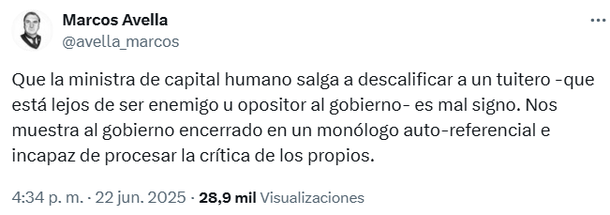 El "fuego amigo" quedó tan al descubierto que otro usuario de Twitter, actual X, llamado Marcos Avella, comentó: "Que la ministra de Capital Humano salga a descalificar a un tuitero -que está lejos de ser enemigo u opositor al gobierno- es mal signo. Nos muestra al gobierno encerrado en un monólogo auto-referencial e incapaz de procesar la crítica de los propios".