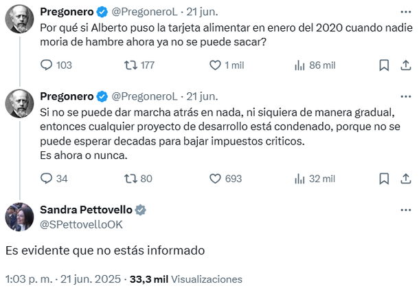 La ministra Sandra Pettovello cargó contra uno de los tuiteros libertarios más influyentes, conocido como Pregonero, la discusión se desató por la toma de deuda para reforzar la Tarjeta Alimentar.